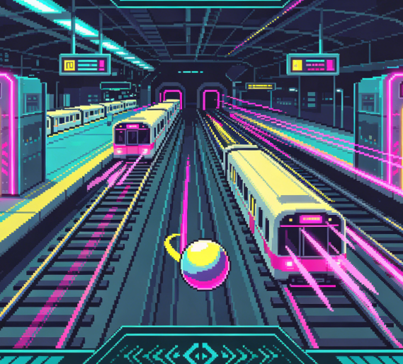 Gameplay: A pinball races at high speed along a subway track, flanked by indicator lights that serve as a metronome. The precise moment a train pulls into a station marks a strong beat in the musical composition; players must tap with pinpoint accuracy at this instant to ensure the ball maintains infinite kinetic energy.
